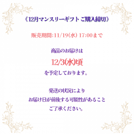 期間内にご購入いただいた【12月マンスリー】商品は同梱発送いたします。