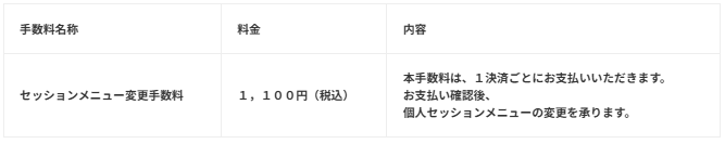 セッションメニューの変更手数料を新設させていただく事となりました。